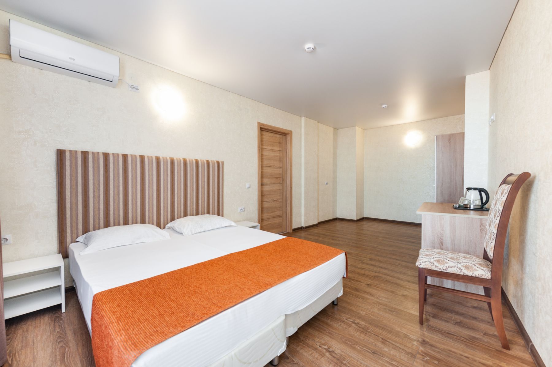 Площадь семейного номера 70 м2. Номер расчитан на 6-10 человек. Состоит из четырех комнат, отдельный сануел, душ. Оснащен: 2 двуспальные кровати (King size), два раскладных дивана, и две полуторных кровати, шкафы, 3 письменных стола, обеденный стол со стульями, холодильник, микровалновая печ. индукционная плита, кофемашина, посуда, 3 плоских ЖК телевизора диагональ 40 дюймов, чайник, сплит системы, бесплатный.