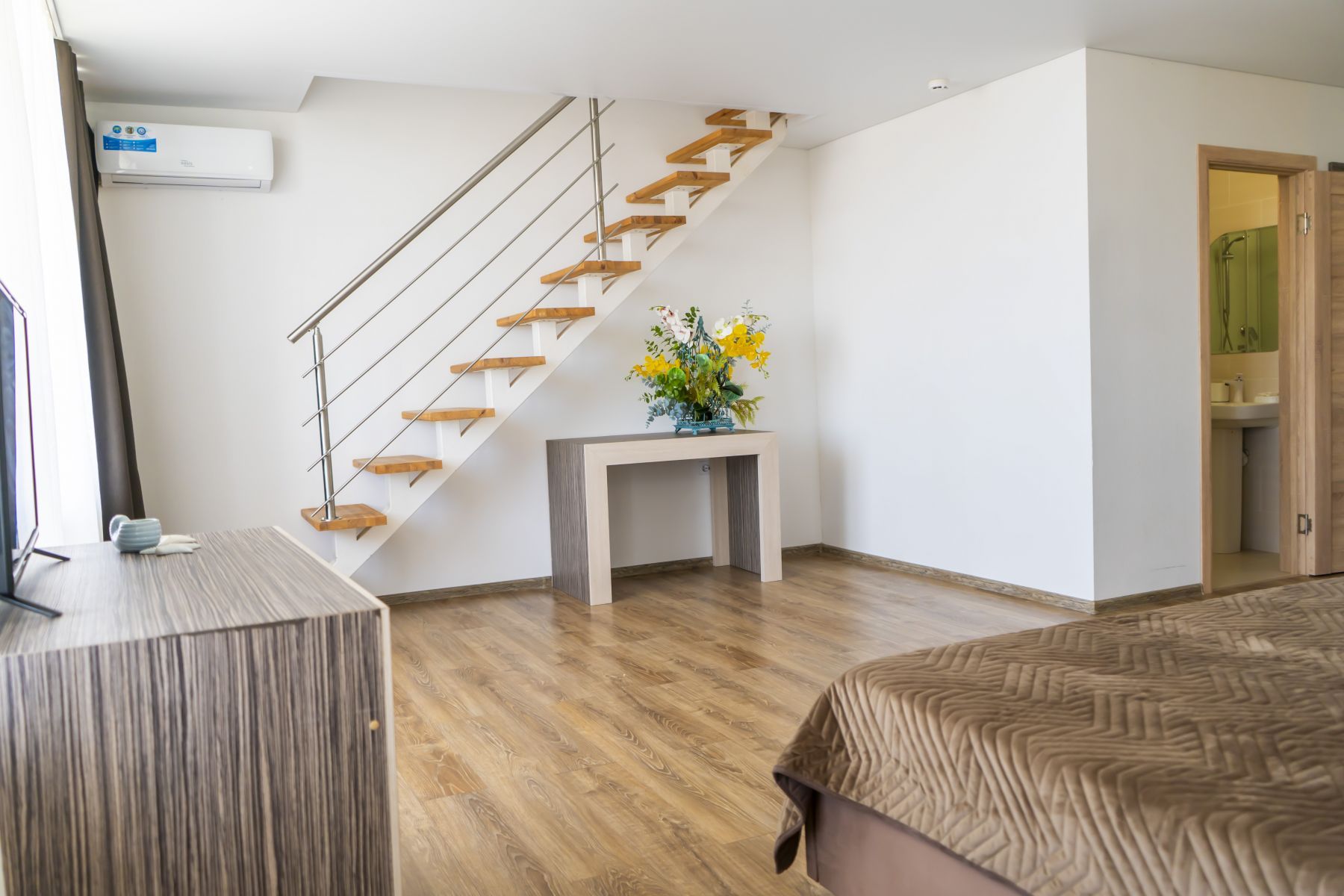 Площадь семейного номера 70 м2. Номер расчитан на 6-10 человек. Состоит из четырех комнат, отдельный сануел, душ. Оснащен: 2 двуспальные кровати (King size), два раскладных дивана, и две полуторных кровати, шкафы, 3 письменных стола, обеденный стол со стульями, холодильник, микровалновая печ. индукционная плита, кофемашина, посуда, 3 плоских ЖК телевизора диагональ 40 дюймов, чайник, сплит системы, бесплатный.