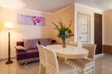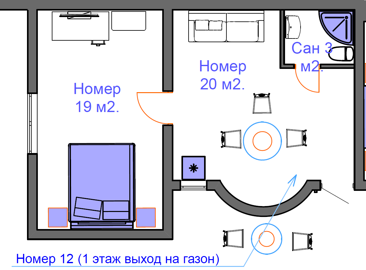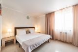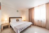 Номер расчитан на 3 человек с возможностью при необходимости поставить дополнительное место за оплату по тарифу. В номере есть санузел, душ, двуспальная кровать (King size), вешалка, шкаф, раскладывающийся диван, письменный стол, чайный столик со стульями, холодильник, комплект полотенец, 2 телевизора диагональ 40 дюймов, чайник, сплит система, бесплатный интернет.