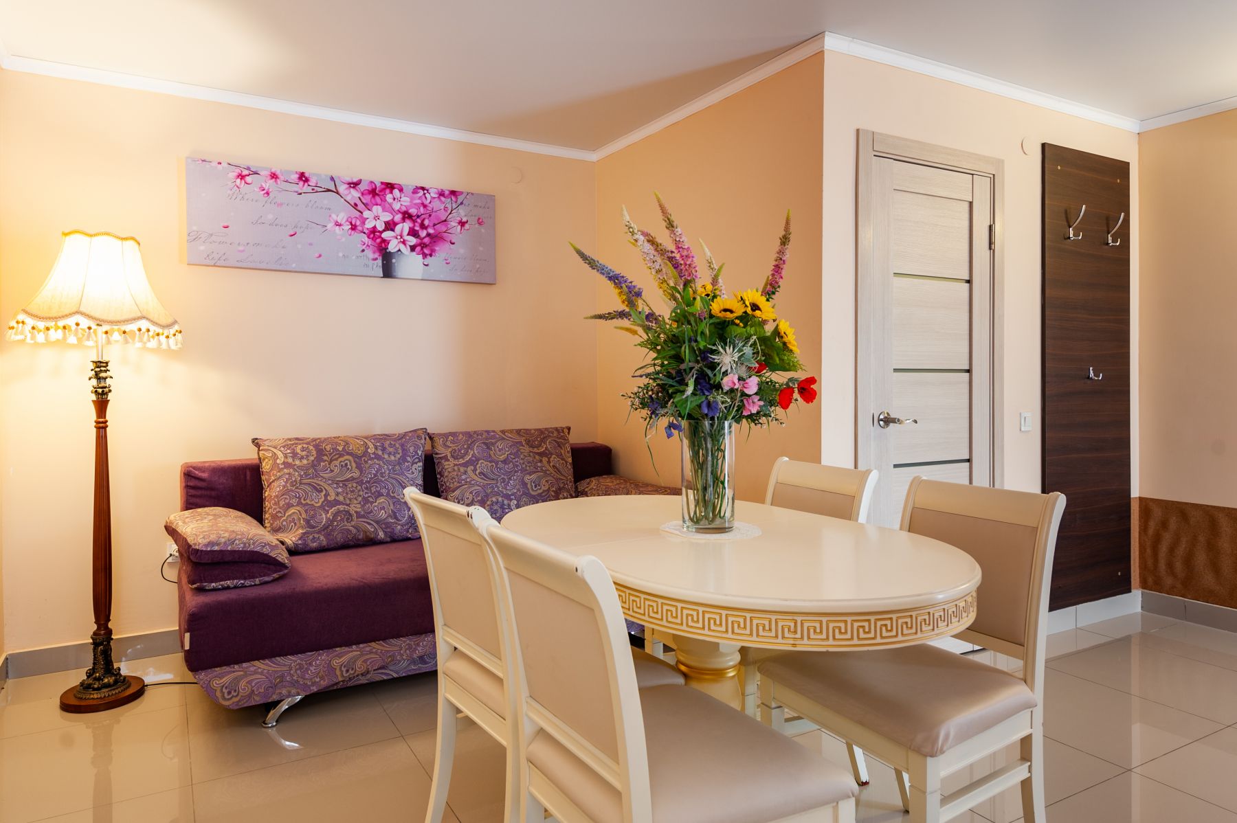 Номер расчитан на 3 человек с возможностью при необходимости поставить дополнительное место за оплату по тарифу. В номере есть санузел, душ, двуспальная кровать (King size), вешалка, шкаф, раскладывающийся диван, письменный стол, чайный столик со стульями, холодильник, комплект полотенец, 2 телевизора диагональ 40 дюймов, чайник, сплит система, бесплатный интернет.