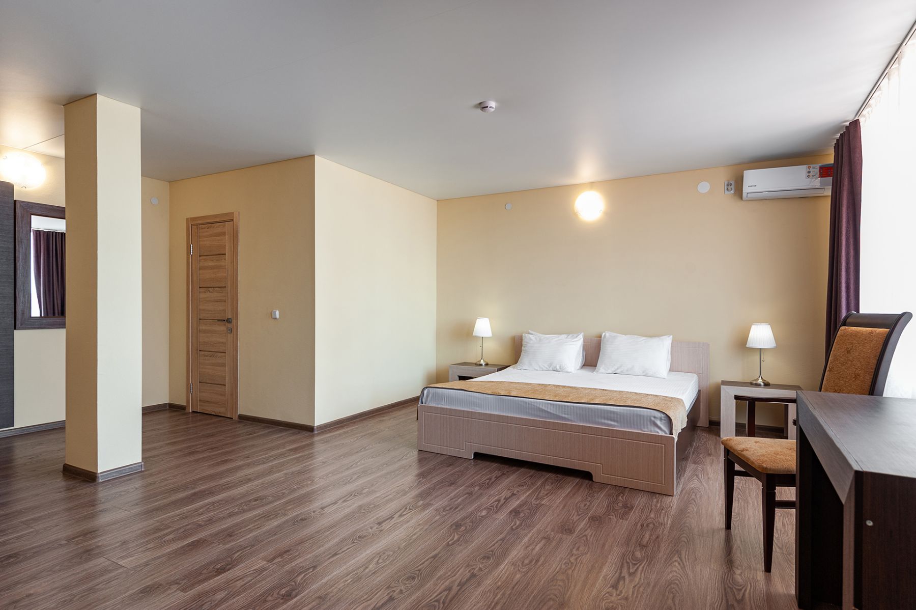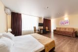 Площадь семейных номеров 35 м2. С балконом. Номер расчитан на 3 человек с возможностью при необходимости поставить дополнительное место за оплату по тарифу . Во всех номерах есть санузел, душ, двуспальная кровать (King size), вешалка, шкаф, раскладывающийся диван, письменный стол, чайный столик со стульями, холодильник, комплект полотенец, телевизор диагональ 40 дюймов, чайник, сплит-система, бесплатный интернет.