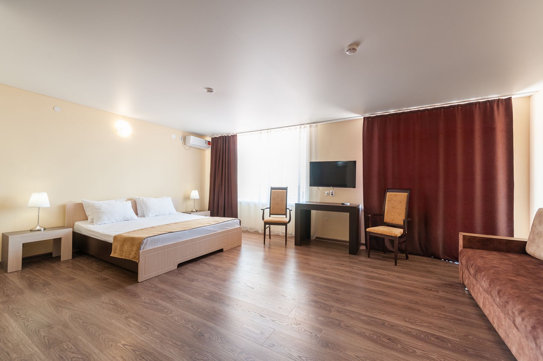 Площадь семейных номеров 35 м2. С балконом. Номер расчитан на 3 человек с возможностью при необходимости поставить дополнительное место за оплату по тарифу . Во всех номерах есть санузел, душ, двуспальная кровать (King size), вешалка, шкаф, раскладывающийся диван, письменный стол, чайный столик со стульями, холодильник, комплект полотенец, телевизор диагональ 40 дюймов, чайник, сплит-система, бесплатный интернет.